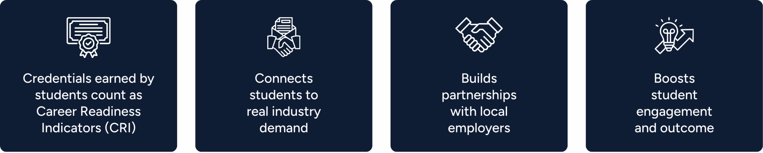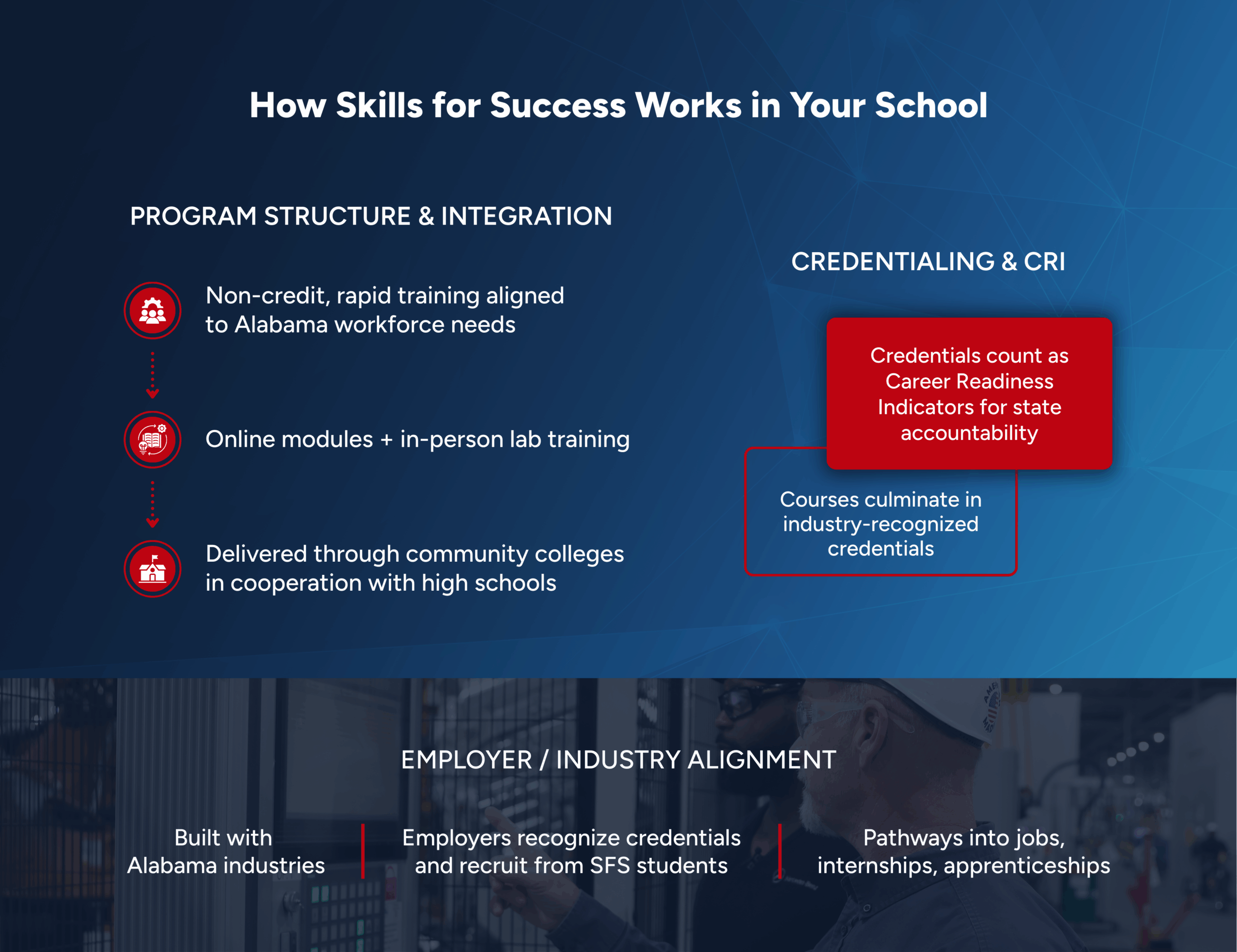 The ACCS Innovation Center partners with Alabama industries to deliver Skills for Success training in high schools, providing students with job-ready skills and credentials recognized statewide. Schools benefit from CRI-earning courses, stronger employer connections, and expanded pathways into high-demand careers. Explore program offerings and complete an interest form to learn more.